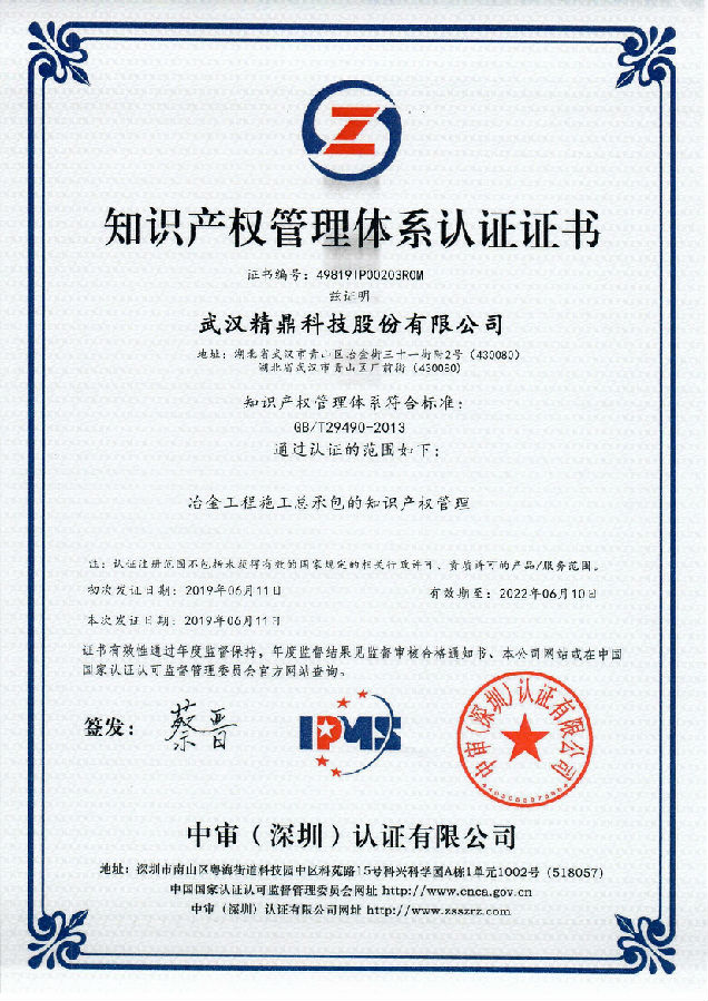 熱烈祝賀武漢精鼎科技股份有限公司于2019年9月獲得知識(shí)產(chǎn)權(quán)貫標(biāo)認(rèn)證證書(shū),這意味著精鼎科技在知識(shí)產(chǎn)權(quán)領(lǐng)域獲得到重要認(rèn)可,在知識(shí)產(chǎn)權(quán)方面得到進(jìn)一步規(guī)范和在綜合競(jìng)爭(zhēng)力得到進(jìn)一步提升。